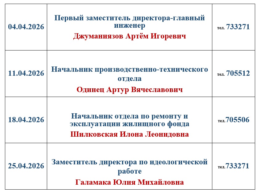 График приёма руководства коммунального унитарного предприятие «Жилищное ремонтно-эксплуатационное управление Ленинского района г. Бобруйска»